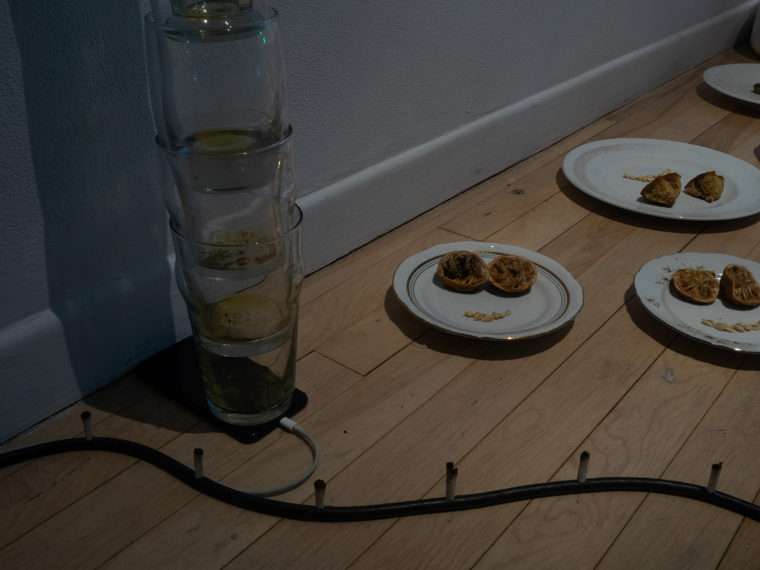 Installation vidéo à 2 canaux créée lors d’une résidence d’un mois à l’Écart. Durant cette période, l’artiste élu domicile dans la galerie. Le lieu occupa simultanément la fonction de chambre, d’atelier et d’espace d’exposition, brouillant les frontières entre l’intime, le travail et le public. Cherchant à rendre compte d’un état de paralysie quelque part entre le repos et l’épuisement, cette exposition explore le potentiel affectif et sculptural des objets de son quotidien. Diverses machines, des câbles, de la vaisselle, des restes de fruits, des déchets ainsi que des effets personnels composent des assemblages laissés à l’abandon; tels les vestiges d’une consommation obsessionnelle et maladive comme remède à un sentiment d’aliénation continuel.